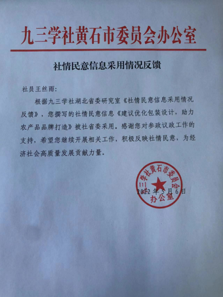 近日,据九三学社黄石市委员会反馈,我校教育与艺术学部专任教师王丝雨撰写的社情民意信息《建议优化包装设计,助力农产品品牌打造》被九三学社湖北省委采用。
