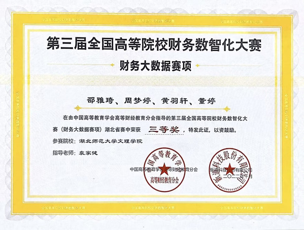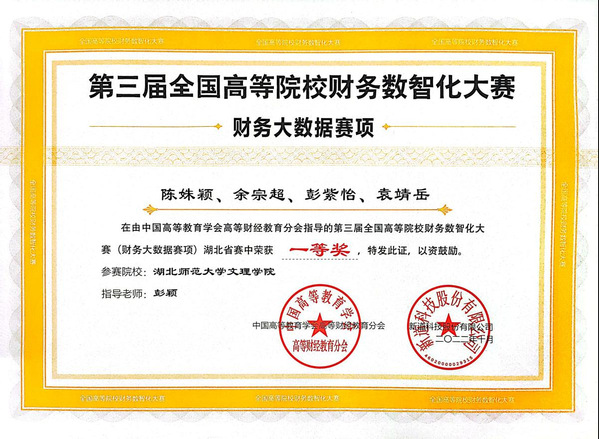 本网讯(通讯员 渣梦丽)10月8日,2022年湖北省第三届全国高等院校财务数智化大赛圆满落幕,我校经济与管理学部财务管理专业由陈姝颖、余宗超、彭紫怡、袁靖岳同学组成的团队获得一等奖,指导教师为彭颖。由邵雅琦、周梦婷、黄羽轩、董婷同学组成的团队在袁家健老师的指导下获得三等奖。