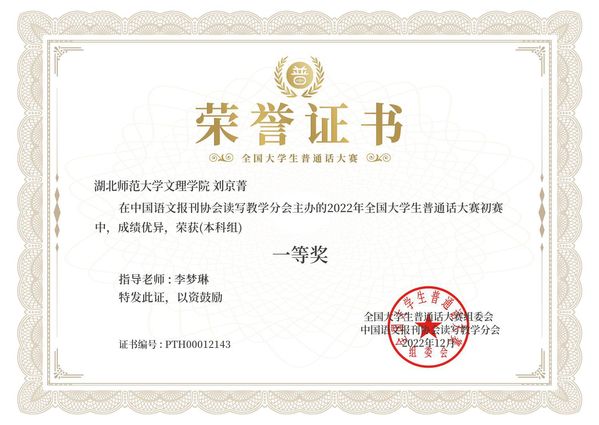 本网讯(通讯员 李梦琳)2022年12月,在由中国语文报刊协会读写教学分会面向全国高校大学生举办的“2022年全国大学生普通话大赛”中,我校“国家普通话水平测试助理团”优秀干事刘京菁荣获本科组全国一等奖(指导教师:李梦琳)。