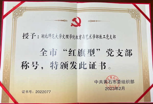 本网讯(通讯员 余复军)近日,黄石市委组织部下发决定,表彰2022年度全市党建工作先进集体,我校教育与艺术学部教工党支部被评为黄石市2022年度“红旗型”党支部。