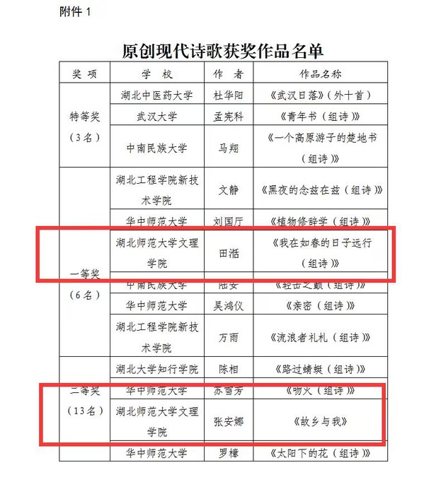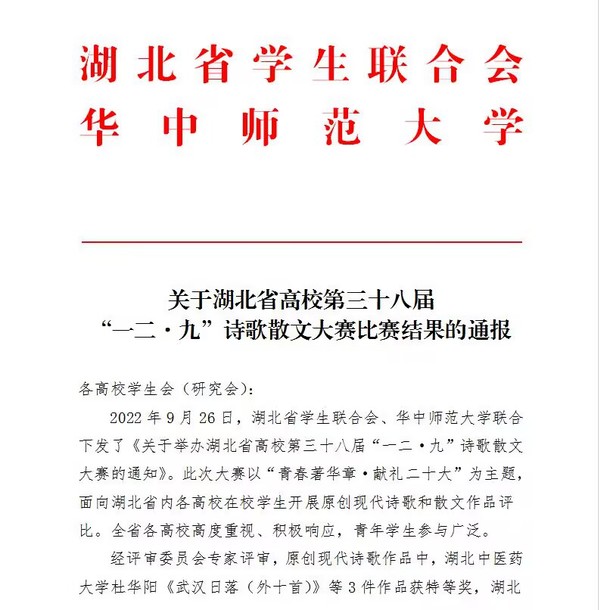 本网讯(通讯员 陈荟芸)我校学子在湖北省高校第三十八届“一二·九”诗歌散文大赛中,荣获原创现代诗歌作品一等奖1项,二等奖1项,三等奖2项。