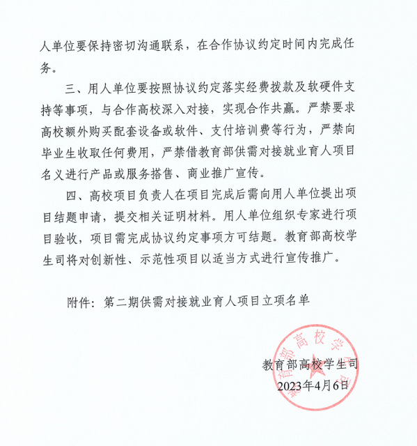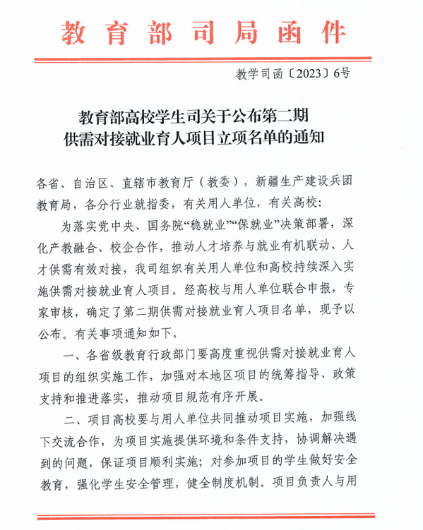 本网讯(通讯员 李娟日前,教育部高校学生司发布了《教育部高校学生司关于公布第二期供需对接就业育人项目立项名单的通知》(教学司函〔2023〕6号),我校有7项供需对接就业育人项目被批准立项,其中定向人才培养培训项目2项、就业实习基地项目3项、人力资源提升项目2项。