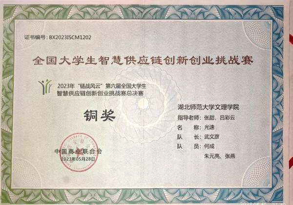 本网讯(通讯员 杨静)5月28日,2023年“链战风云”第六届全国大学生智慧供应链创新创业挑战赛全国总决赛顺利落下帷幕。我校经管学部张甜、吕彩云老师指导,武文彦,何成、朱元亮、张燕组成的光速队获得了本科组团体总决赛铜奖,挑战赛一等奖;杨林海、全永鑫、谢显根、黄颜彪组成的四个葫芦娃队获挑战赛三等奖,创造了我校参与此项赛事以来的最好成绩。