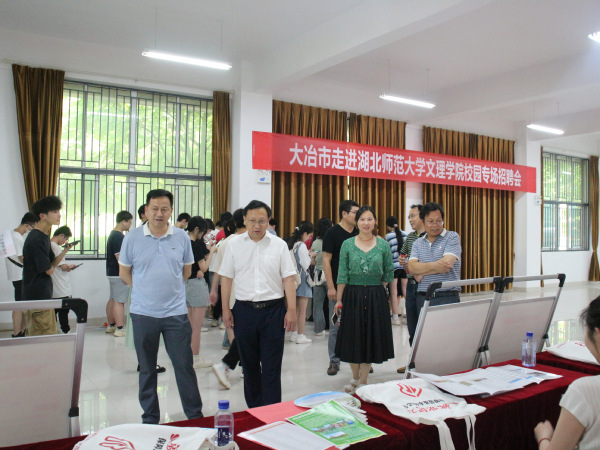 本网讯 (通讯员 肖劲光 拍摄 梁宏滨)为进一步促进我校毕业生高质量充分就业,深化政校企三方合作,6月13日下午,我校与大冶市人力资源和社会保障局、大冶湖高新技术产业开发区联合开展2023年“才聚荆楚·百县进百校”就业促进专项行动。校党委书记杨邓红、党委副书记杨之毛、副院长王胜国现场指导工作。