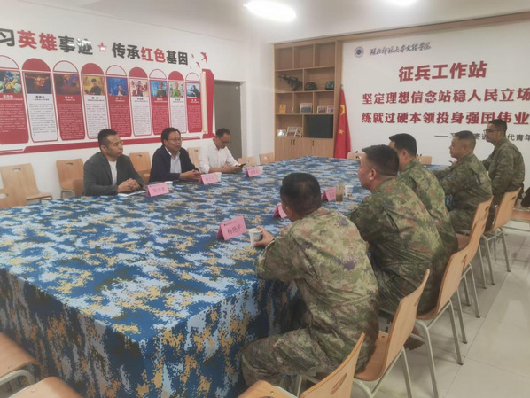 本网讯(通讯员 秦雯雯)10月30日下午,黄石市军分区陈高泉副司令、王震处长、李昌恒参谋,黄石港区武装部杨艳平部长、徐志猛政委一行莅临我校检查指导征兵工作站建设,我校党委副书记杨之毛、学工部部长汪崇文及相关人员陪同检查并参加座谈会。