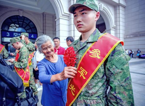 在汉口火车站广场上,预定新兵蔡子豪的身边,围着一大群送行的亲人。其中一位满头银发的老奶奶特别引人注目,她就是蔡子豪的太奶奶。