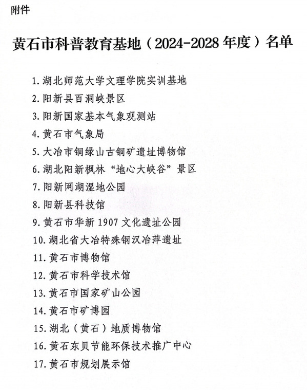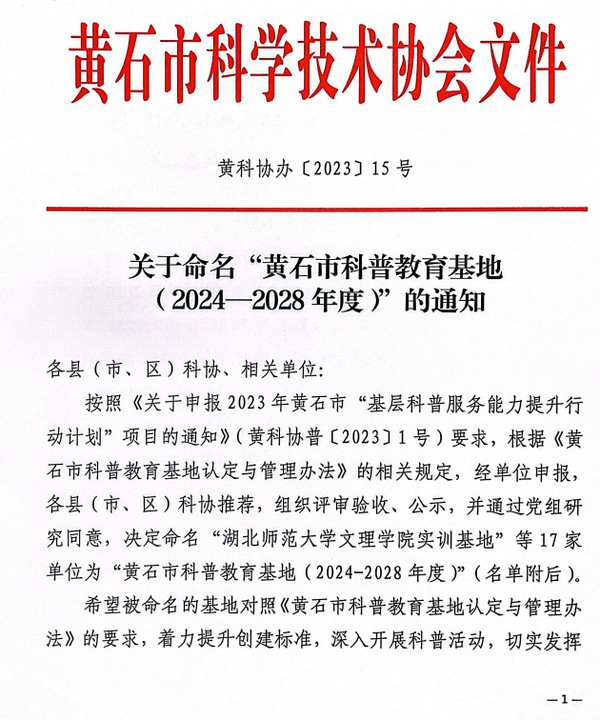 本网讯(通讯员 杨海梅)黄石市科协办近日发文,公布了“关于命名黄石市科普教育基地(2024—2028年度)的通知(黄科协办〔2023〕15号)”,黄石市共17家基地入选,我校实训基地均入选在列。