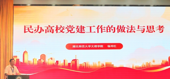 杨邓红以《民办高校党建工作的做法与思考》为题,分享了我校加强党建和思想政治工作的经验做法。近年来,我校深入学习贯彻习近平新时代中国特色社会主义思想,全面贯彻党的教育方针,坚持社会主义办学方向,在健全完善党建工作体系制度、推进基层党组织标准化规范化建设、加强思想政治理论课建设和师德师风长效机制建设、加强意识形态阵地管理,以及凝聚人心、推动发展、维护安全稳定等方面成效突出。同时,他也实事求是分析了民办高校党建思政工作存在的薄弱环节,并提出了改进建议。