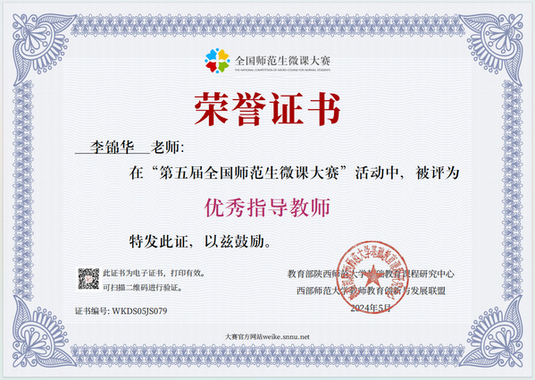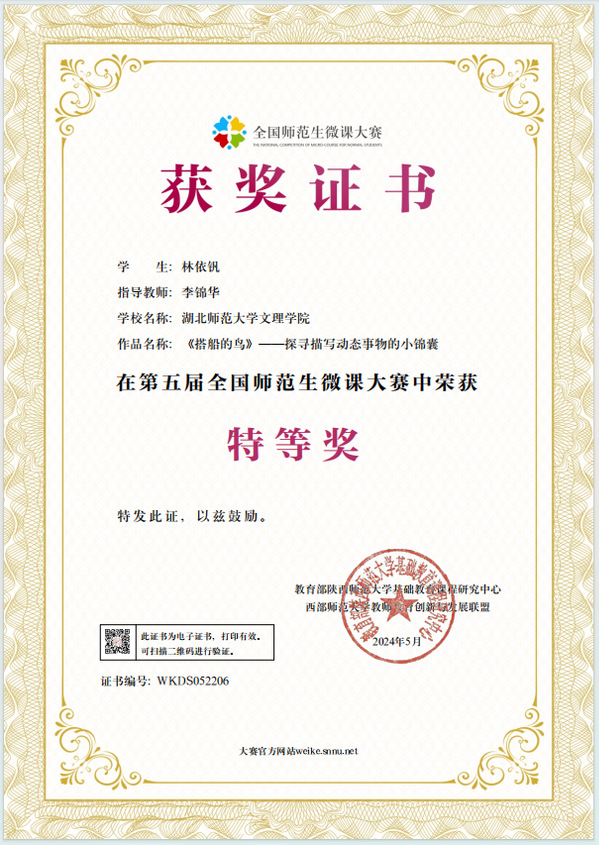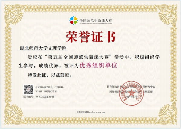 本网讯(通讯员 黄蓓佳)近日,第五届全国师范生微课大赛获奖名单公布。我校选拔推荐的微课参赛作品获得佳绩,荣获特等奖1个、一等奖1个、二等奖8个、优秀奖5个,我校荣获“优秀组织单位”,教育与艺术学部李锦华荣获“优秀指导教师”称号。