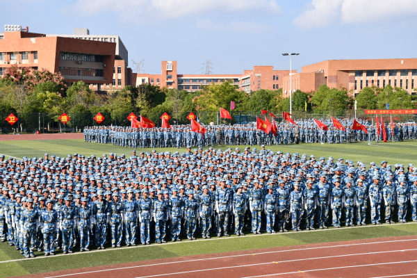 李开灿向全体新同学表示热烈的祝贺和欢迎,向辛勤指导军事训练的全体教官致以了衷心的感谢和崇高的敬意。在向新生们简要介绍了学校的基本情况后,他对新生提出三点希望:一是要高扬理想风帆,做好人生规划,勇当忠诚先锋。努力向优秀的学长学姐们看齐,坚定不移听党话、跟党走,努力成长为堪当民族复兴重任的时代新人。二是要勤奋努力学习,锻造过硬本领,勇当实践先锋。现在的“学习”不止是要多读“有字之书”,钻研专业知识;还要多读“无字之书”,投身社会实践;同时还要多读“心灵之书”,提升心理健康素养。三是要磨砺意志品质,绽放青春光彩,勇当奋斗先锋。要尊重同学之间的差异,心存善念、学会倾听、理解包容,学会帮助,大家一起尽快适应新环境,取得新进步。