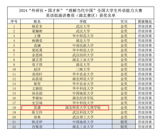 荆楚网(湖北日报网)讯(记者吕鉴蕾通讯员邓薇薇王婉馨)记者14日从天空官网平台获悉,在2024年“外研社·国才杯”“理解当代中国”全国大学生外语能力大赛(湖北赛区)决赛中,该校学生以出色的表现荣获“英语演讲”赛项一金一铜的优异成绩。其中,荣获金奖的苗盛同学是湖北省所有民办高校唯一的晋级国赛的选手,创造了民办高校的“第一次”。