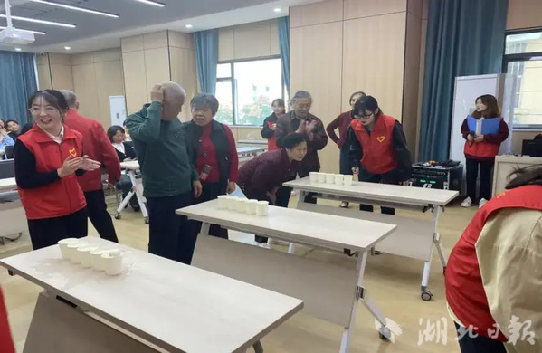活动现场,志愿者献上了精彩纷呈的文艺表演。悠扬歌声传递着对老年人的深情祝福,曼妙舞姿为老年人带来了视觉盛宴,“吹乒乓球过水杯”“击鼓传花”等环节的游戏活动,更是让老年人乐在其中,重返了青春岁月。