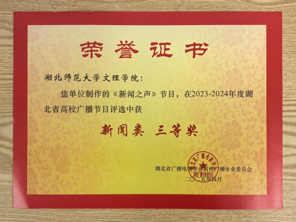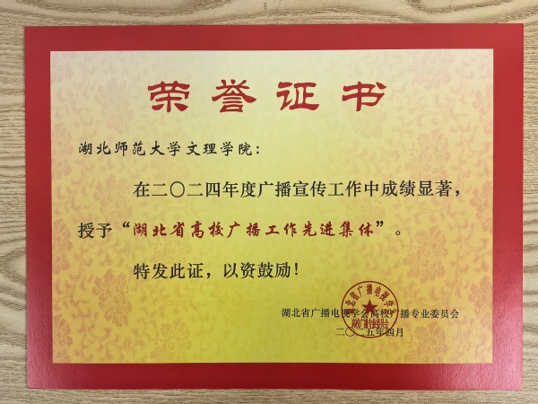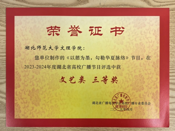 本网讯(通讯员 李乐)4月25日,湖北省高校广播专业委员会工作会议在湖北经济学院召开,评选通过了2024年度湖北省高校广播节目评选结果,我校广播台获“湖北省高校广播工作先进集体”的荣誉称号,广播台《以箔为墨,勾勒华夏脉络》节目荣获“文艺类”三等奖,《新闻之声》节目荣获“新闻类”三等奖。
