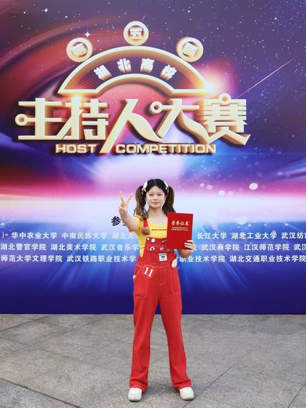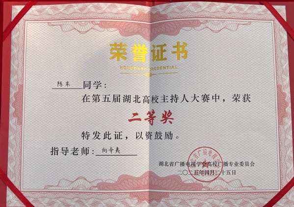 本网讯(通讯员 李乐)4月25日,第五届湖北省高校主持人大赛在湖北经济学院大学生活动中心举行。我校广播台播音员、人文学部中文2405班学生陈末在比赛中荣获二等奖。