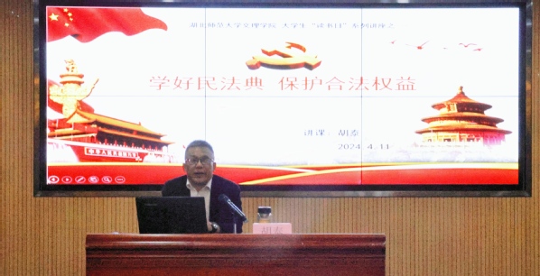 本网讯(通讯员 李湘湘 史秋蕊)为强化大学生对《民法典》的认知和理解,增强同学们运用《民法典》维护自身权益的意识和能力,引导同学们养成尊法、学法、守法、用法的思维方式和行为习惯。4月11日下午两点半,我校在图书馆报告厅举办“湖山讲坛”第五讲——《民法与大学生生活》,本次活动由校党委宣传部、图书馆联合举办,100余名文理学子现场聆听。本期主讲嘉宾为湖北师范大学青马工程理论导师、湖北省基层理论宣讲员、黄石市委宣讲团成员胡泰教授。