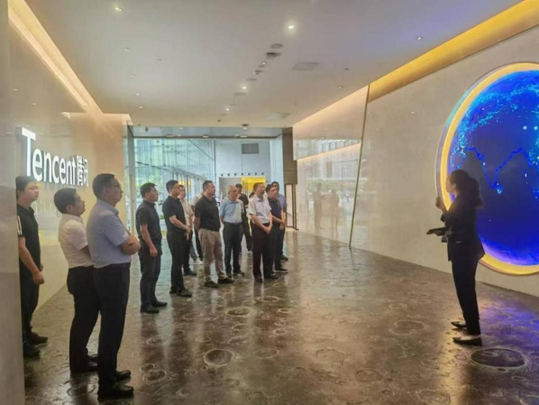 在腾讯领导带领下,李开灿一行首先参观了腾讯展厅,通过系列多媒体装置和项目案例,了解腾讯在人工智能、云计算、大数据等前沿技术上的创新和应用,以及数字技术未来的广阔空间和可能性。