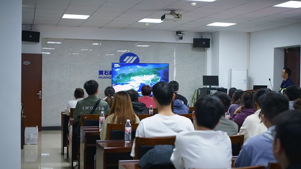 在园区讲解员的引领下,首先参观现代物流园,讲解员为大家介绍了新港现代物流园的项目简介、智慧园区、业务范围及主要合作伙伴等情况。接着参观三期气膜,讲解员介绍新港现代物流园攻克太阳能光伏板轻质化、柔性化与气膜一体化等难题,首创新能源技术与气膜完美结合的新能源光伏气膜,开启气膜行业的“双碳”之路。然后,前往码头参观黄石新港12号泊位。最后杨邓红书记、经管学部领导老师与黄石新港领导进行了深入探讨,并在见习、实习、就业、项目合作和人才培训等方面达成了初步合作意向。黄石新港港口股份有限公司副总经理陈海在综合会议室给学生们介绍了黄石新港情况以及未来发展规划,学生与其热烈互动。