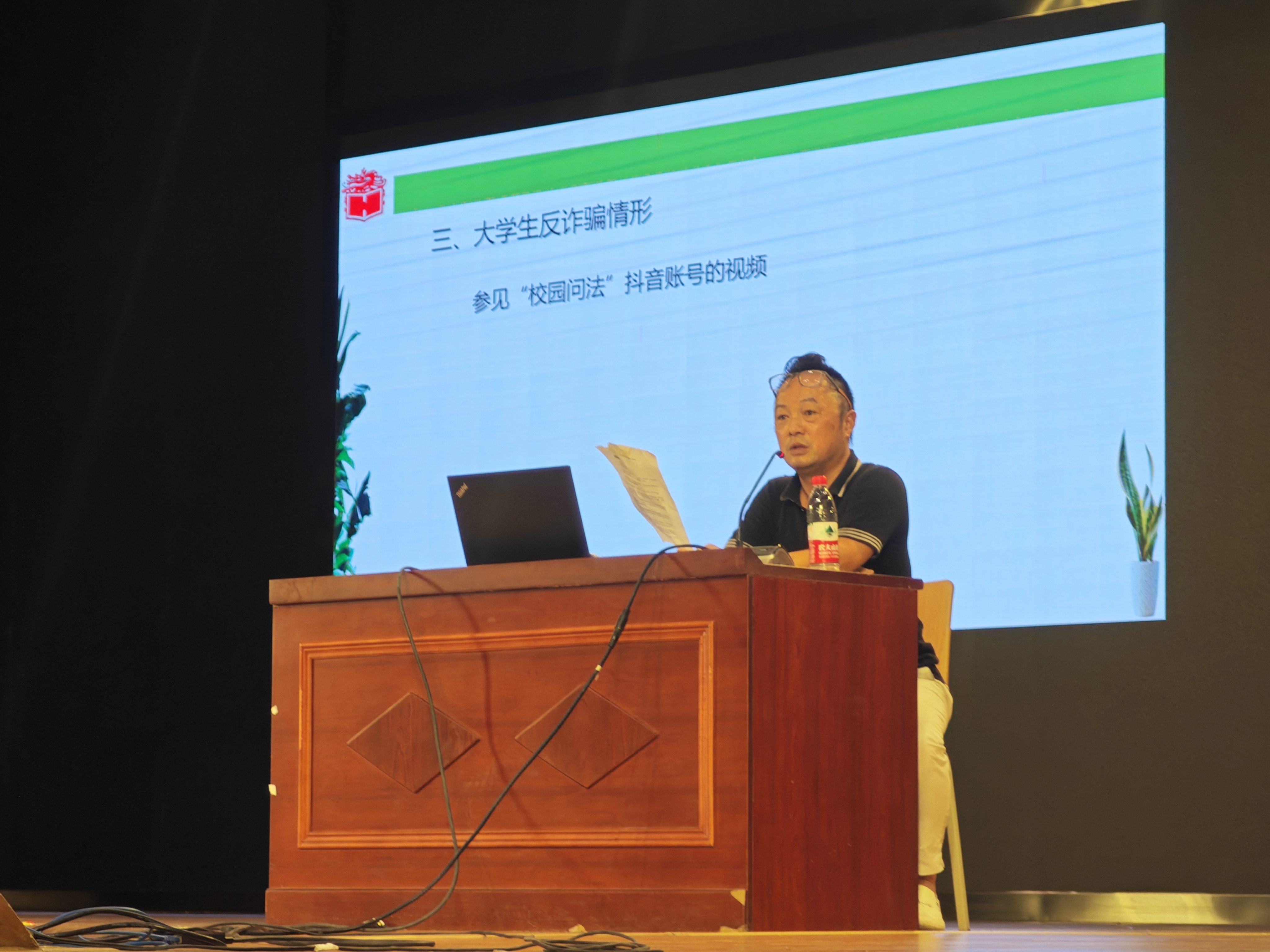 为有效遏制网络电信诈骗犯罪高发态势,切实提高大一新生的防范意识和识别能力,2024年9月28日下午15:00,天空官网平台理工学部在学术交流中心举行“大学生校园问法学习生活反诈暨国庆假期安全班会”。讲座特邀嘉宾山东师范大学法学院潘劲松教授为主讲人,理工学部党总支副书记肖圣芳书记,2024级新生辅导员朱明亮、王洁、李春娜老师出席。理工部2024级全体新生、2023级全体班委参加。此次活动面对全体新生及23级班委,旨在更有效地开展大学生反诈骗宣传工作,适应大学生社交平台交流的趋势。