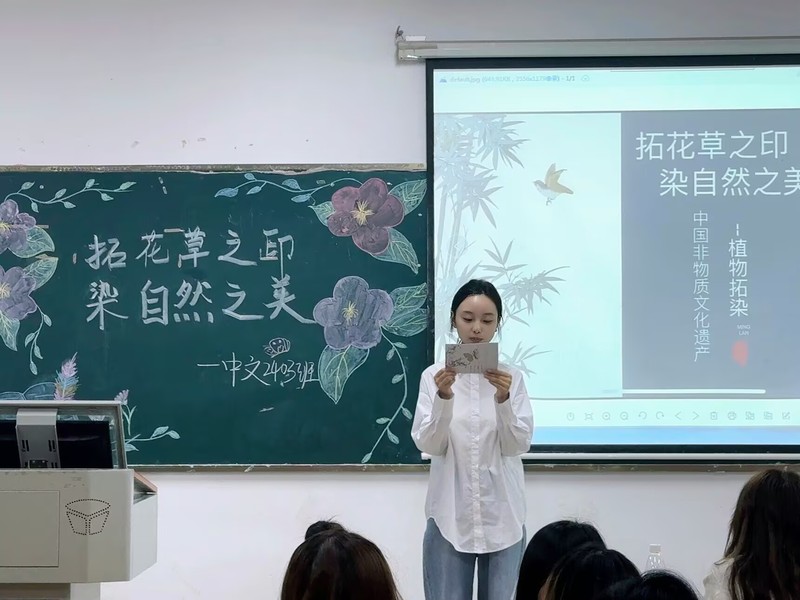 20241114日晚,中文2403班在1A106教室举办了一场别开生面的植物拓染活动,主题为“拓花草之印,染自然之美”。此次活动不仅让同学们亲手体验并传承这一传统染色技艺,也展示了植物拓染艺术的独特魅力。