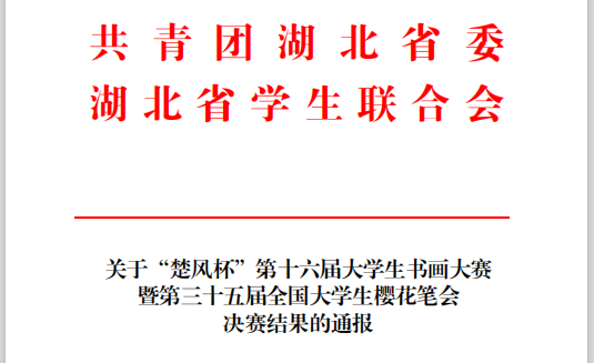 12月23日,团省委、省学联下发了关于“楚风杯”第十六届大学生书画大赛暨第三十五届大学生樱花笔会决赛结果的通知。我校夏诚、徐子惠、李黎分别荣获硬笔组二等奖、软笔组三等奖、绘画组优秀奖。