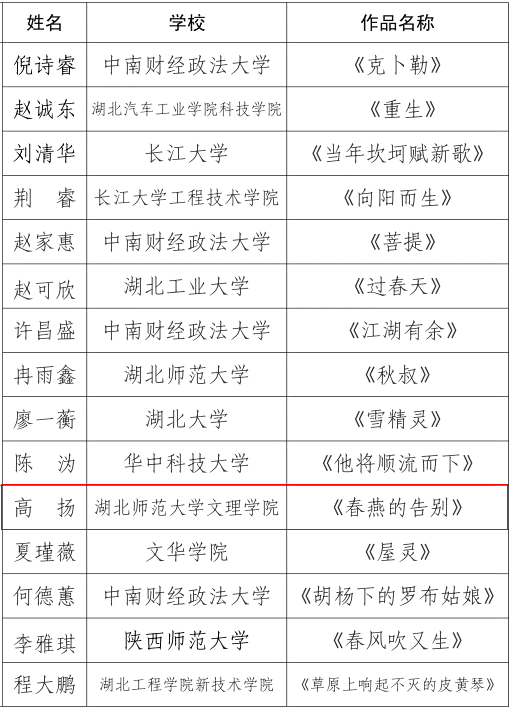 近期,湖北省高校第十九届“福创杯”新青年小说大赛获奖名单出炉,经过评委层层筛选,我校高扬和施雨涵两位同学荣获大赛二等奖,熊子延教授获得优秀指导老师奖。