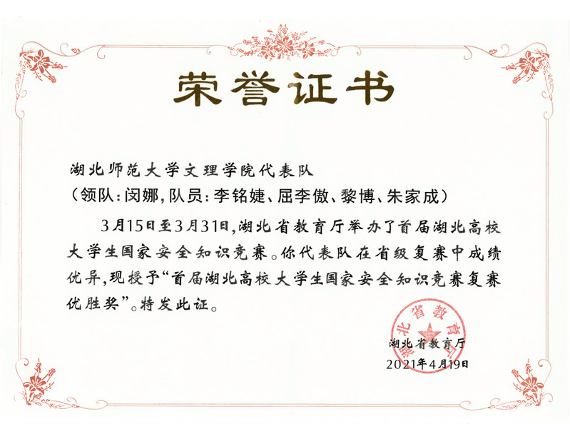 (通讯员:汪丽莎)2021年3月15日至3月31日,湖北省教育厅举办了首届湖北高校大学生国家安全知识竞赛,我校由闵娜老师,学生李铭婕、屈李傲、黎博、朱家成组成的代表队凭其扎实的知识功底,在省级复赛中取得优异成绩,荣获优胜奖。