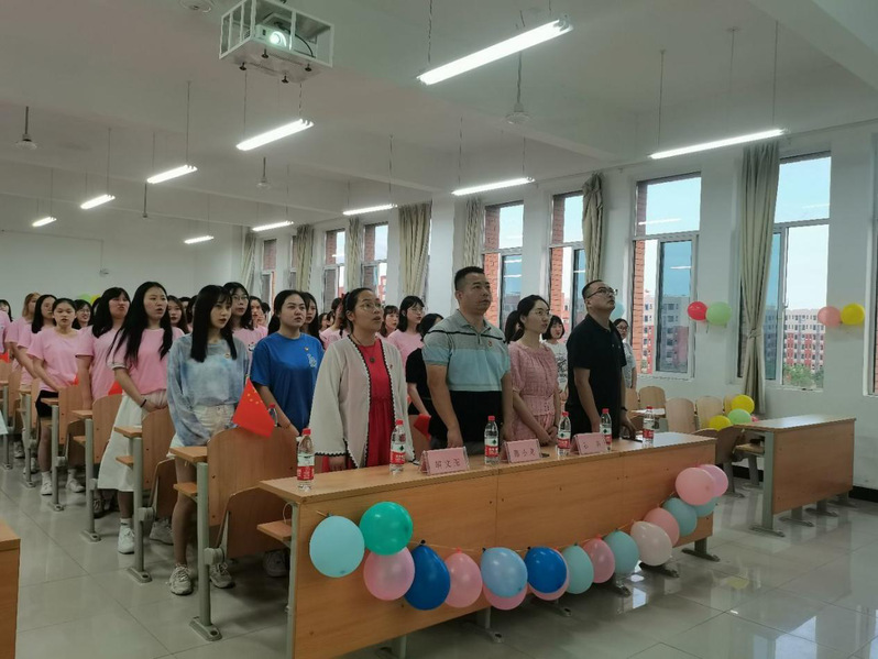 活动伊始,全体同学共唱团歌,新发展的四名团员上台由老师为其佩戴团徽,并在老团员的带领下进行入团宣誓。主持人带领一同回顾波澜壮阔的党史历程,交流环节中,同学们积极举手发言,畅谈学习心得,共同表达出对峥嵘岁月的敬仰与承担历史责任、使命的深刻认识。最后,全体同学合唱《我和我的祖国》。