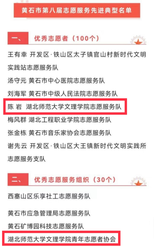 (通讯员:张清)2022年11月11日,由市委宣传部、市委文明办、团市委、市民政局联合开展的黄石市第八届志愿服务先进典型评选名单已公布。我校陈岩同学、青年志愿者协会分别荣获“黄石市优秀志愿者”“黄石市优秀志愿服务组织”称号。