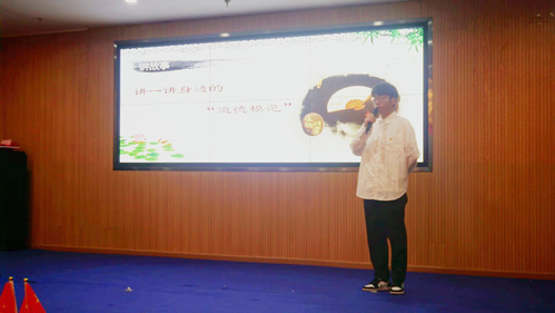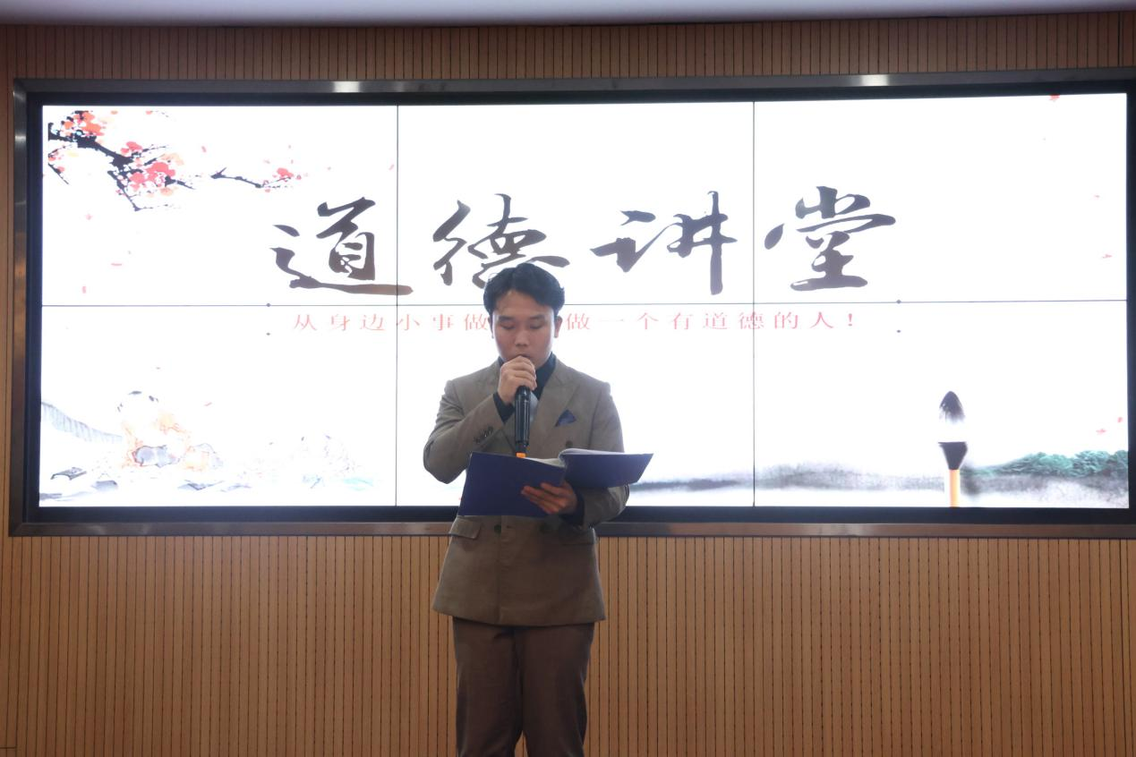 活动按照“道德讲堂”建设工作的要求展开,共分为唱道德、学模范、讲故事、诵经典、省自身、谈感悟、送祝福七个环节。活动开始三位同学对什么是道德、为什么要讲道德、怎么讲道德这三个问题分别分享了自己的见解。他们的话语中充满着对道德的深刻理解,也表达出践行道德的坚定决心。