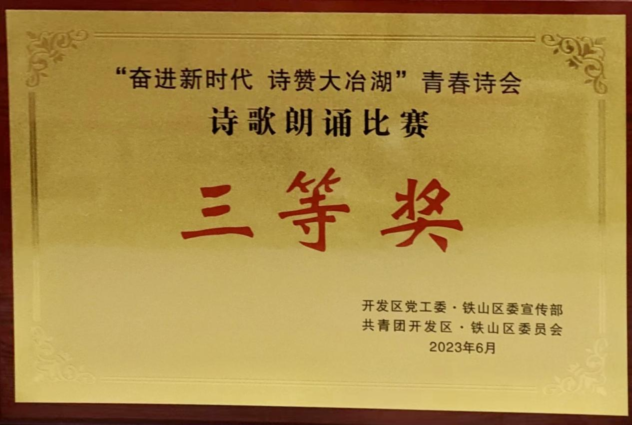 (通讯员:苏祎)青春礼赞,建功时代。6月25日,由开发区党工委·铁山区委、开发区管委会·铁山区政府主办,党工委·区委宣传部、团区委承办的青春诗会朗诵比赛在市展演。在此次活动中,我校参赛作品“青春携诗意,活力漫开铁”诗伴舞和“林茂水美大冶湖”配乐诗分别荣获“一等奖”、“三等奖”。
