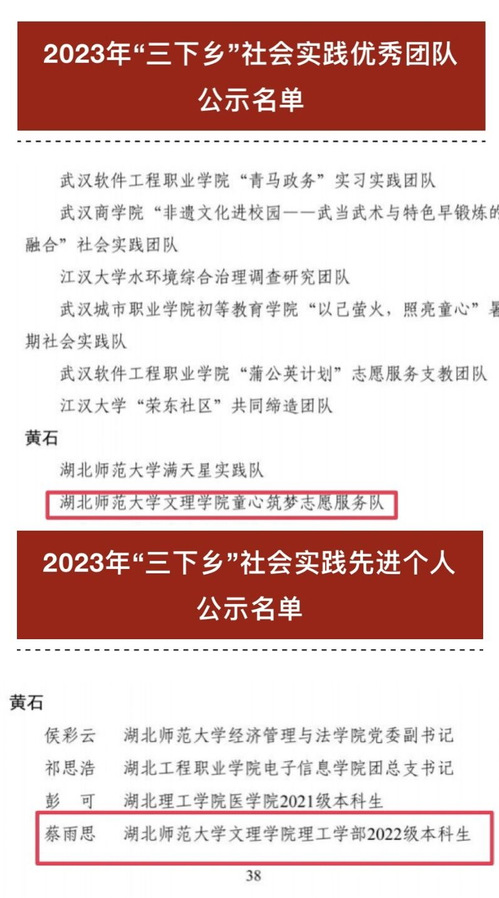 (通讯员:王梓千寻)湖北省大中专学生志愿者暑期文化科技卫生“三下乡”社会实践活动总结通报结果已公布。我校童心筑梦志愿服务队被评为“三下乡”社会实践优秀团队,理工学部2022级本科生蔡雨思同学被评为“三下乡”社会实践先进个人。