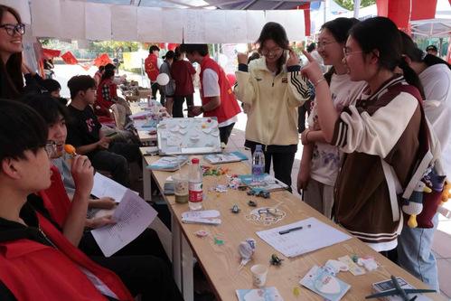理工学部青支队设置“雷锋故事分享”便利贴墙、“科学探索之旅”实验原理挑战和“化学分子拼图”模型搭建等活动。在互动体验中感受科学魅力,助力科学知识普及,为公益集市增添别样色彩。