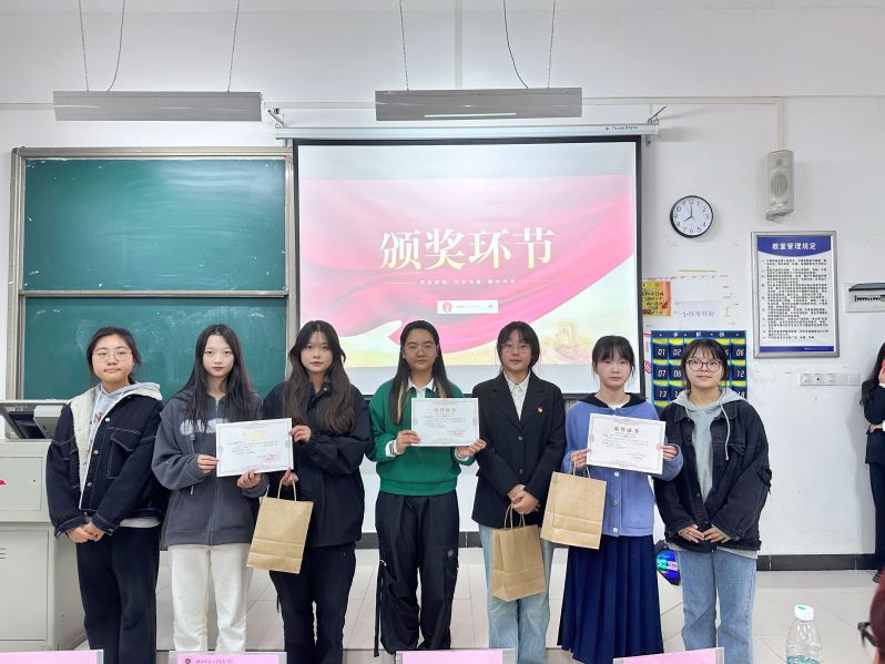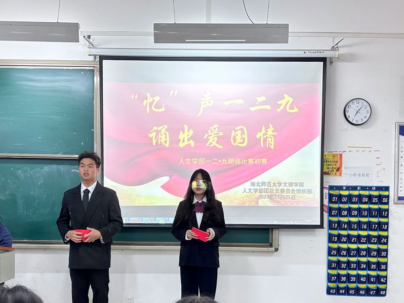 为纪念一二九运动,我校人文学部团学组织部1121日晚上七点在教室1B207举行主题为“忆声一二九诵出爱国情”的诗词朗诵比赛。本次比赛的评委有人文学部团委副书记王海琳、实创部部长杨新月、学习部部长黄璐妍、体育部副部长韩睿文艺部朗诵副部周琪,秘书部副部孟佳一。           主持人介绍此次比赛规则以及评委人员后,比赛正式开始。本次比赛选手自行挑选爱国诗篇进行朗诵一号选手江竞妍朗诵《青春中国》字里行间澎湃着对祖国的热爱感受到一个蓬勃向上的中国。七号选手刘思琴和谢铝馨带来的《万疆》,让我们感受到了华夏山河的壮丽辽阔、丰饶富足和国泰民安,我们身为华夏儿女引以为傲。罗玟朗诵的《百年恰似风华正茂》给我们呈现朝气蓬勃、积极向上的青春形象,激励我们青年人要以更加奋发昂扬日新月异的精神状态投入新征程。比赛过程中,选手们声情并茂的朗诵诗歌,诵出了铿锵有力报国赤心,诵出了爱国者舍身为国的碧血丹心。通过本次比赛警醒我们作为年轻一代,绝对不能失去一二九运动传承下来的爱国主义精神要有与民族山河共存亡的气魄。           一二九朗诵比赛”获奖名单如下:                                                        一等奖:周婧文                                                                                二等奖:彭晶晶徐薇                                                                          三等奖:周瑜胡妍钰、王姝喻刘思、谢铝馨                                优秀奖:胡世蓉江竞妍罗玟谢佳琦