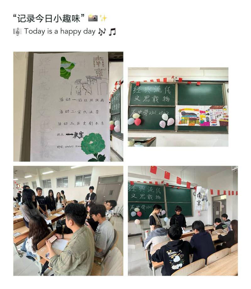 人文学部历史学23012302班于417日下午在教学楼2B304举办以“历”久弥新,与“史”同行为主题的教室快闪活动。活动分为自制与品尝宋代冰茶、diy掐丝珐琅画、爱国主义剧本杀南京1937、合唱《上春山》四个部分。