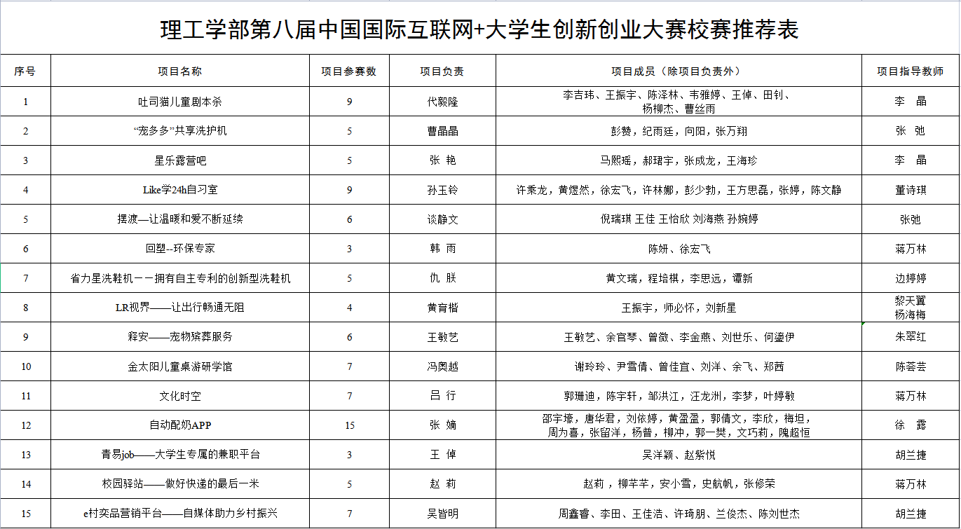 2022年4月26日,理工学部接到第八届中国国际“互联网+”大学生创新创业大赛的工作通知后,经过学部开会讨论,辅导员组织学生参赛小组,专任教师认领小组并进行企业计划书和网报流程的指导。5月14日,学部收集了100组学生的企业计划书,抹去指导老师和专业班级信息,并对企业计划书进行了随机编号。5月15日,学部邀请2位专业的评委进行企业计划书的初选。