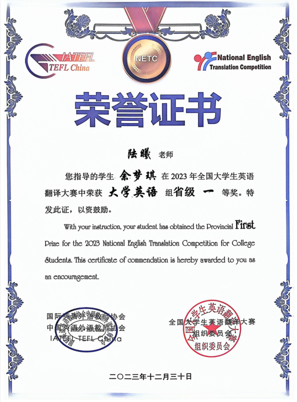2023年全国大学生英语翻译大赛顺利完赛。来自清华大学、北京大学、武汉大学、浙江大学、复旦大学、厦门大学、中国人民大学等2161所高校,近6万名学子参加了竞赛。我校理工学部网络工程2301班余梦琪同学荣获省级一等奖辅导员陆曦老师获指导老师奖。