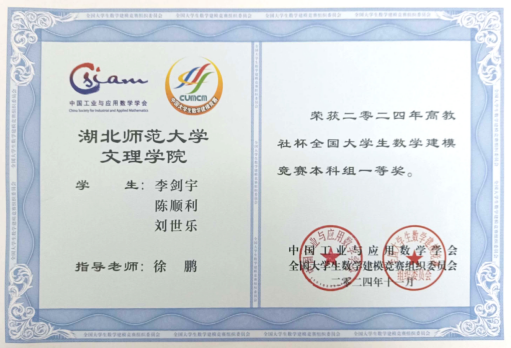 年高教社杯全国大学生数学建模竞赛中荣获本科组一等奖!