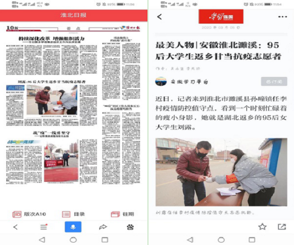 日前,我校经管学部学生、预备党员刘露在家乡安徽省濉溪县参加疫情防控工作事迹被“学习强国”平台、腾讯大楚网、《淮北日报》、淮北文明网等多家媒体报道。