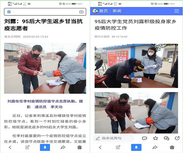 刘露2016年考入我校法律专业,今年即将毕业。放寒假后,刘露于1月12日乘高铁返回安徽省濉溪县孙疃镇任李村。2月8日,完成居家隔离的刘露找到村党总支主动申请担负疫情防控志愿服务,被安排到全村最重要的值守点。她工作耐心细致、认真负责,赢得了全村干部群众的一致好评。在全村党员及志愿者的共同努力下,有四千多人口的任李村未出现一例感染病例。