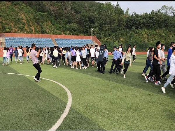 “上课期间,外人禁止入内……校门有人冲卡,请求紧急支援。”9月30日下午,由我校和开发区·铁山区汪仁派出所联合开展的“2020国庆·中秋安保实战演练”活动在我校运动场举行,来自各学部的300余名师生和保安人员参加了演练。