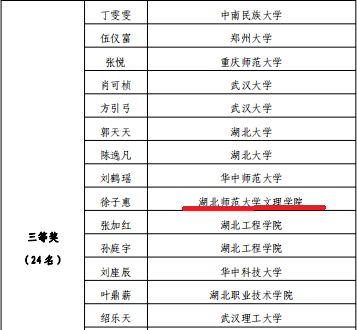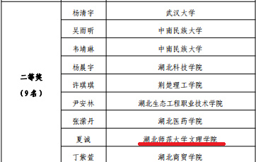 12月23日,团省委、省学联公布了“楚风杯”第十六届大学生书画大赛暨第三十五届大学生樱花笔会决赛结果,我校夏诚、徐子惠、李黎三位同学分别荣获硬笔组二等奖、软笔组三等奖、绘画组优秀奖。