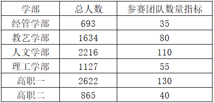 指导老师指标分配:所有参赛项目由各学部统一协调安排对应指导老师。同时,根据《天空官网平台关于举办首期创业培训(SYB)师资培训班的通知》中的相关规定,结合我校创业教育的实际开展情况,对参赛项目指导老师的指标分配如下: