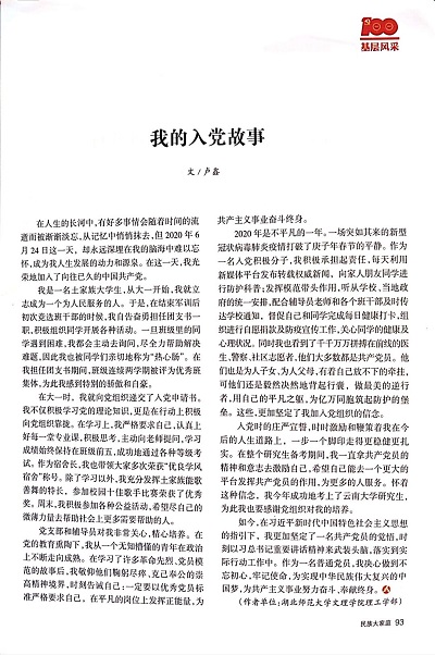 日前,从省市相关部门传来喜讯,我校数学与应用数学1704班毕业生卢鑫撰写的文章《我的入党故事》,在湖北省民族宗教事务委员会主管的刊物《民族大家庭》增刊《庆祝中国共产党成立100周年—湖北民宗初心故事》上发表,为我校争得了荣誉。