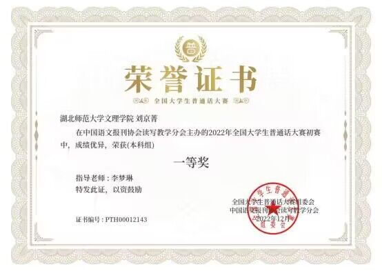 2022年12月,我校人文学部汉语言文学专业2004班学生刘京菁(国家普通话水平测试助理团优秀干事)在由中国语文报刊协会读写教学分会面向全国高校大学生举办的“2022年全国大学生普通话大赛”中荣获本科组全国一等奖(指导教师:李梦琳)。