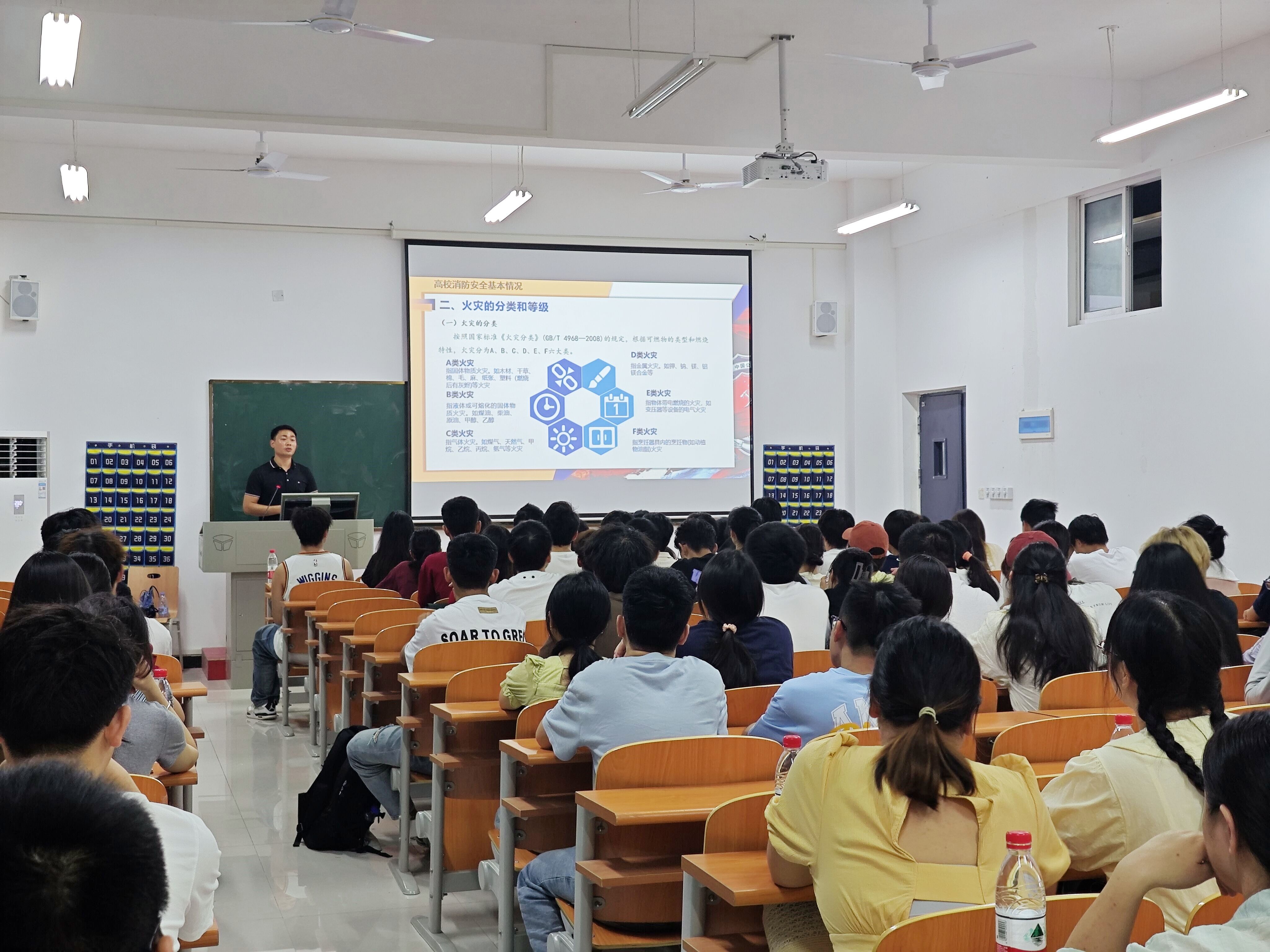本次示范班会邀请了后勤保卫部涂亦乐老师,他首先为大家介绍了火灾的概念、如何区分不同火灾的种类和等级,同时结合高校消防安全工作相关文件,介绍了校园内各类消防设备,引导师生们要自觉爱护校园消防设备。最后通过列举近几年高校火灾数据、图片资料的讲述,以案说法,引导同学们增强消防安全意识,提高消防安全能力,最大限度地减少校园火灾隐患,共同创建平安和谐校园。