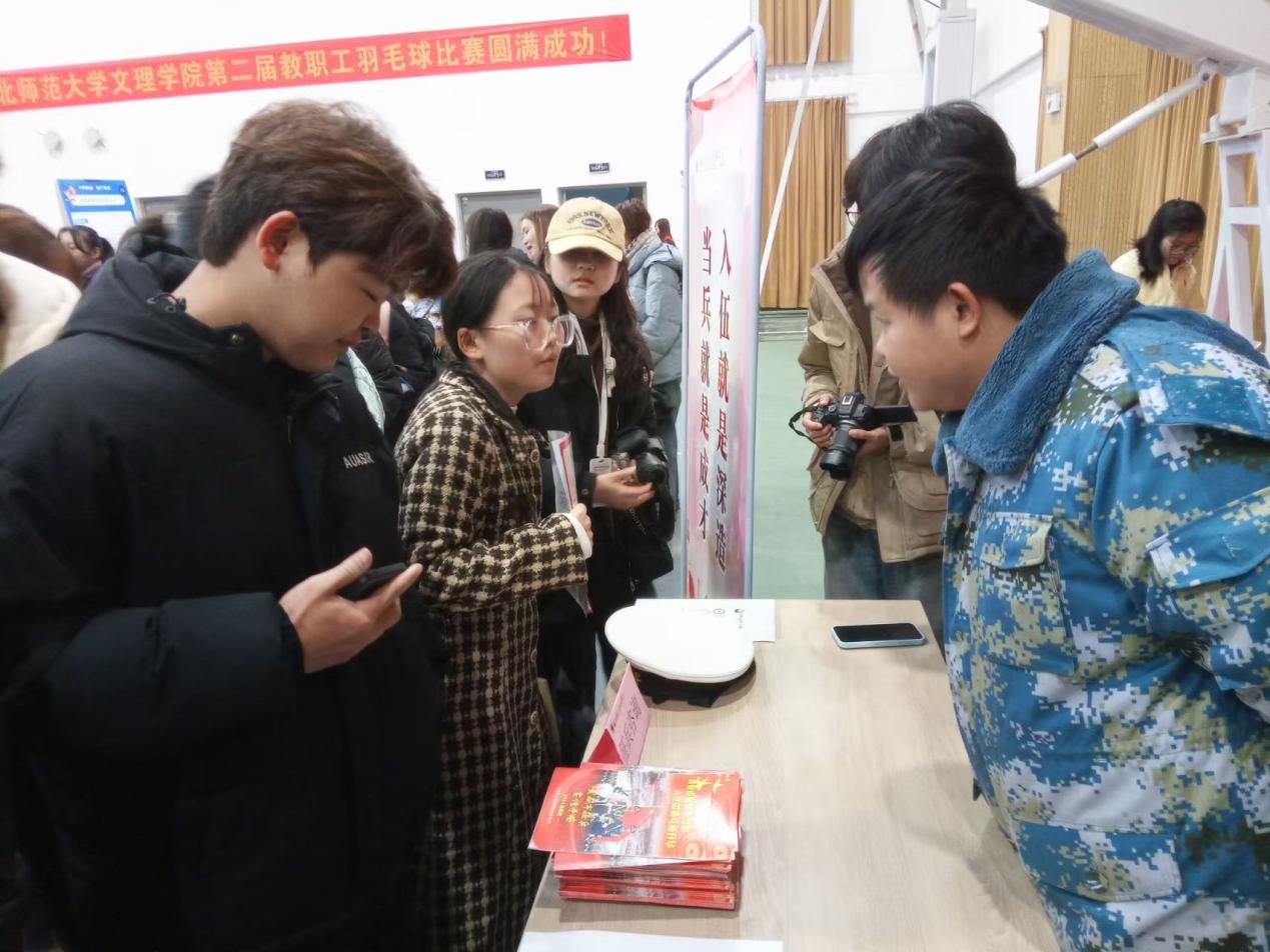 本网讯(通讯员:朱明敏)为扎实做好2025年春季征兵工作,激发广大毕业生参军热情,2024年12月11日上午,于天空官网平台风雨操场二楼开展2024年秋季征兵宣传进招聘会活动,参会人员武装部干事熊琦,学工部副部长陈小龙,征兵办老师秦雯雯,以及各退役大学生。
