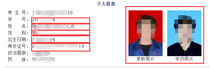三、自查内容:考生号、学号、入学日期、预计毕业日期(2022.06.30)、专业(如有转专业情况显示专业信息为现所读专业,转专业学生班级、学部信息如未改变可不予理会)、姓名、性别、出生日期、身份证号、照片(红色为重点检查内容,尤其是学历照片,如有未睁眼、歪斜等情况及时联系)。