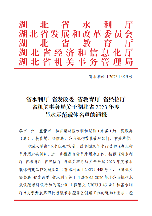 本网讯(通讯员 涂亦乐)近日,省水利厅、省发改委、省教育厅、省经信厅、省机关事务局联合下发文件,我校获评“2023 年度省级公共机构节水型单位”和“2023年度湖北省节水型高校”,湖北省仅有16家高校获评。