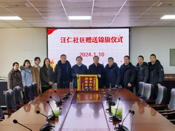 本网讯(通讯员 陈小龙)1月10日下午,我校包保社区汪仁社区书记柯钦荣一行五人来校赠送了“服务社区解民忧 共筑共建情谊深”锦旗,同时向我校全体下沉党员送来了“助力社区、感谢有你”的感谢信,表达了对学校教职工党员参与社区包保工作的感谢之情。在校全体校领导及相关工作负责人参加活动。