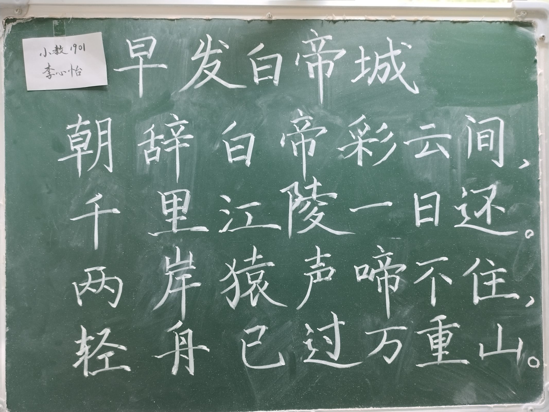 本次比赛共收到238幅作品,选手们在规定的时间内以小黑板的形式按要求进行规范字的书写。每位参赛选手认真书写李白诗词《早发白帝城》作为参赛作品,参赛同学作品刚劲有力、潇洒飘逸、大方得体、秀气隽美。经评委老师评定,以下参赛选手获奖,具体名单如下:
